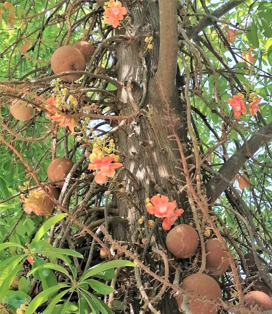 Sur la droite, vous verrez un arbre  »boulets de canon » sacré pour les bouddhistes, car Bouddha serait né et mort près d’un couroupita guanensis. Puis vous pourrez passer 3 fois sous l’éléphant en bois de teck à 3 têtes, cela apporterait bonne fortune.