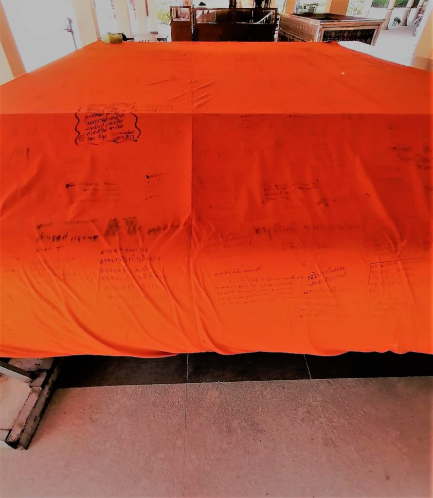 Lors de cérémonies, le moine est drapé d’un immense linceul orange sur lequel les fidèles écrivent prières ou vœux, tout au long de l’année.